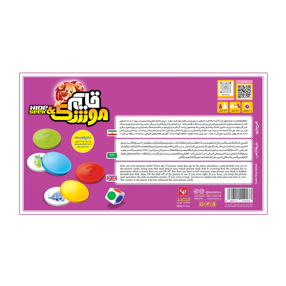 قایم موشک یک بازی حافظه محور فوقالعاده جالب است که میتوان با روشهای گوناگون از آن برای تقویت حافظهی گروههای سنی مختلف، از ۳ ساله گرفته تا ۱۰۳ ساله استفاده کرد. اساس بازی چنین است که تعدای پولک تصویری زیر تشتکهای رنگی گذاشته میشوند و بازیکن باید حدس بزند که زیر تشتک چه تصویری پنهان شده است. بازی اصلی را با ۶ تشتک به رنگهای مختلف و تاسی که روی هر وجه آن همان رنگها چاپ شده است انجام میدهیم ولی برای بچههای کوچکتر میتوان از تشتکهای کمتر و تصاویر کمتری استفاده کرد. یا میتوان در ابتدا فقط از ۶ پولک استفاده کرد و پس از آنکه کودک هر ۶ تصویر را شناخت روی آنها را با تشتکها پوشاند و با انداختن تاس از کودک خواست تصویر زیر آن تشتک رنگی را نام ببرد.