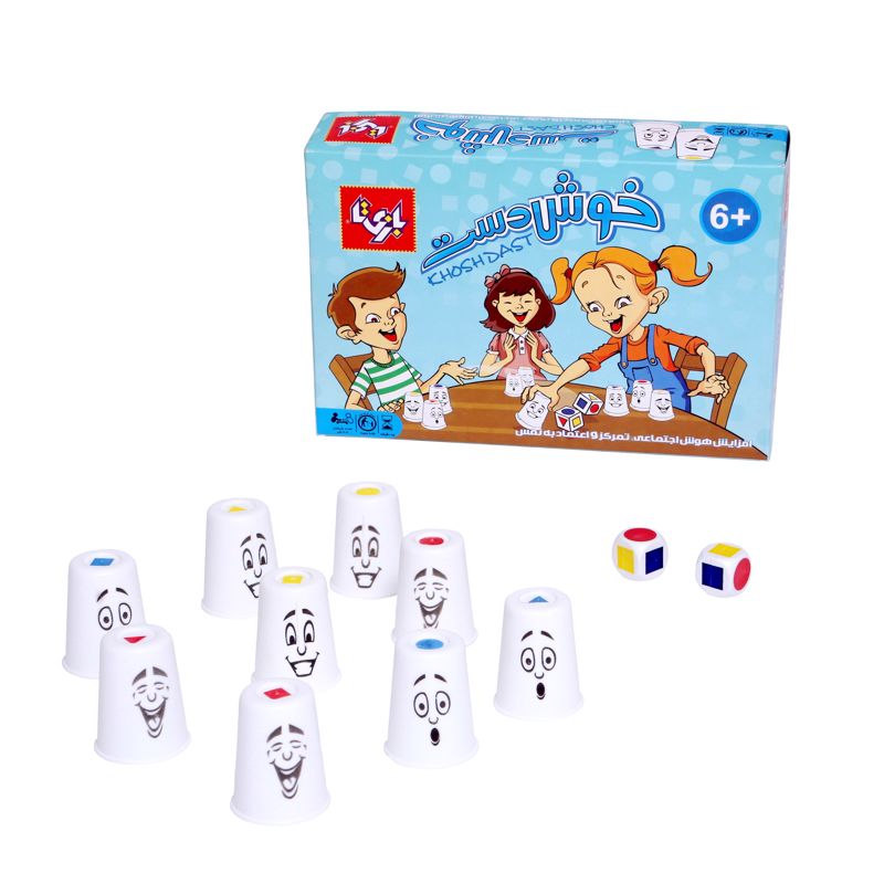 خوش دست یک بازی ساده و پر هیجان است که یکی از مهمترین مهارتهای لازم برای زندگی و بخصوص علم ریاضی یعنی تفکر منطقی و قدرت استدلال را به شیوهای جذاب به کودکان آموزش میدهد. در این بازی تعدادی لیوان داریم که ته آنها یکی از سه شکل مربع، مثلث یا دایره به یکی از سه رنگ قرمز، آبی و زرد چاپ شده است. دو تاس هم داریم که روی هر وجه آنها یکی از شکلها به یکی از رنگها قرار دارد. هر دو تاس با هم ریخته میشود و بازیکنان باید بر اساس تاسهایی که آمده است، زودتر از بقیه لیوان درست را انتخاب کنند و بردارند. اگر هر دو تاس یک شکل با همان رنگ را نشان بدهند، باید همان لیوان را برداشت؛ اما اگر تاسها متفاوت باشند باید لیوانی را برداشت که شکل یا رنگ یا هر دو در تاسها موجود نباشد.