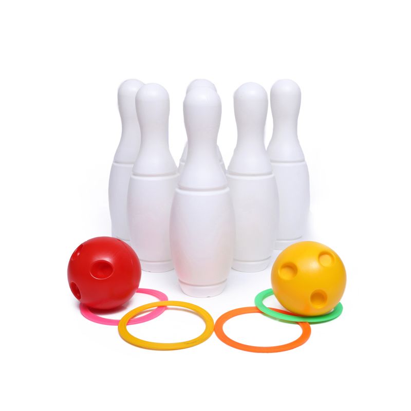 بولینگ یکی از با نشاطترین ورزشهایی است که میتوان در کنار خانواده به آن پرداخت و شادمانی را دو چندان کرد. در سنین پایینتر انداختن، قل دادن و گرفتن توپ موجب پرورش هماهنگی بین چشم و دست کودک میشود و سرعت و مهارتهای حرکتی او را افزایش میدهد. در عین حال، انجام این بازی شادابی و سلامت جسمی کودکان را به همراه دارد. با این مجموعه میتوان دو بازی بولینگ و حلقه پرتاب را به صورت انفرادی و یا گروهی انجام داد. از ویژگیهای این محصول کیفیت عالی و وزن مناسب آن است که استفاده از آن را در خانه، کودکستان، مدرسه و هر جای دیگر آسان می سازد. رنگ سفید پینها باعث میشود بیشتر شبیه بازی بولینگ بزرگسالان باشد و این امر در جلب توجه کودکان مؤثر است. این محصول در اندازهی کوچک هم عرضه میشود.