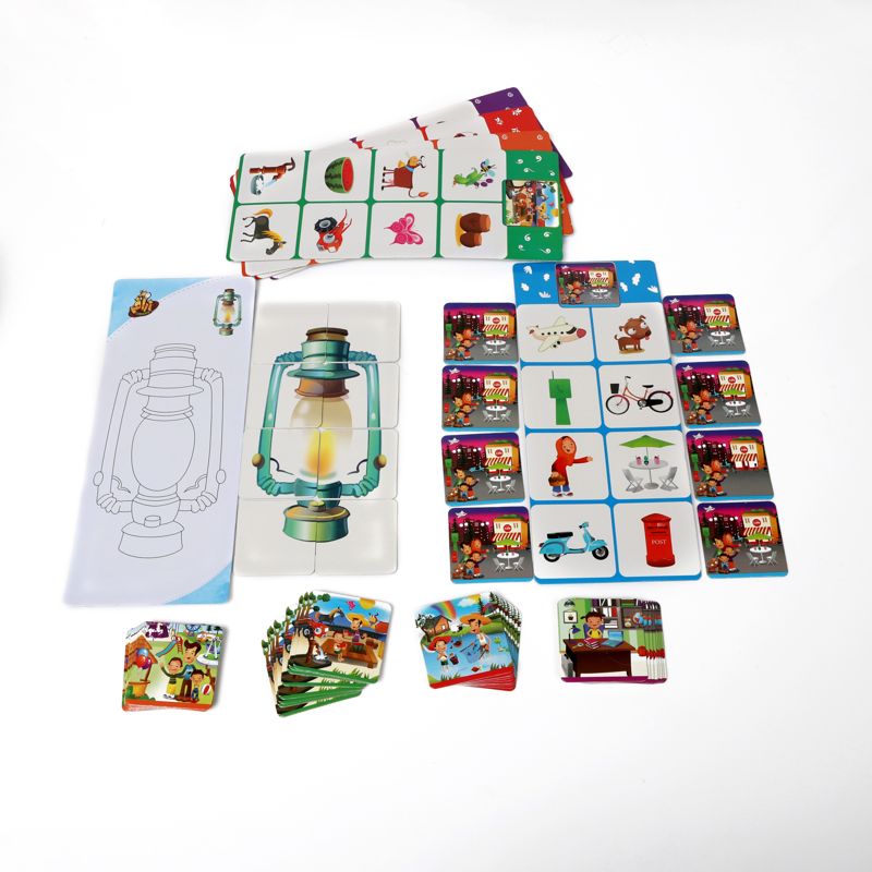 قایم باشک در واقع شبیهسازی بازی معروفی است که در آن یک نفر از اتاق بیرون میرود و بقیه چیزی را برمیدارند یا جابجا میکنند تا موقع برگشتن متوجه شود چه چیزی عوض شده است. در این بازی نیز ۶ کارت بزرگ وجود دارد که در بالای آن تصویری از محیطی نشان داده شده است. کودک باید به دقت تصویر را نگاه کند و کارتهای کوچک را متناظر با چیزی که از تصویر بالا حذف شده است در کنار جای درست بگذارد. سپس کارتهای کوچک را به صورت برعکس روی جای خود میگذارد. اگر درست چیده باشد تصویری کامل از ۸ قطعه کارت به وجود میآید. این بازی به تقویت حافظه و بالا رفتن دقت کودک کمک میکند. بعلاوه میتوان از پشت کارتهای بزرگ به صورت جورچین یا با هدف رنگآمیزی هم استفاده کرد.