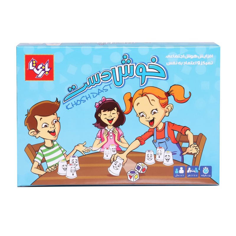 خوش دست یک بازی ساده و پر هیجان است که یکی از مهمترین مهارتهای لازم برای زندگی و بخصوص علم ریاضی یعنی تفکر منطقی و قدرت استدلال را به شیوهای جذاب به کودکان آموزش میدهد. در این بازی تعدادی لیوان داریم که ته آنها یکی از سه شکل مربع، مثلث یا دایره به یکی از سه رنگ قرمز، آبی و زرد چاپ شده است. دو تاس هم داریم که روی هر وجه آنها یکی از شکلها به یکی از رنگها قرار دارد. هر دو تاس با هم ریخته میشود و بازیکنان باید بر اساس تاسهایی که آمده است، زودتر از بقیه لیوان درست را انتخاب کنند و بردارند. اگر هر دو تاس یک شکل با همان رنگ را نشان بدهند، باید همان لیوان را برداشت؛ اما اگر تاسها متفاوت باشند باید لیوانی را برداشت که شکل یا رنگ یا هر دو در تاسها موجود نباشد.