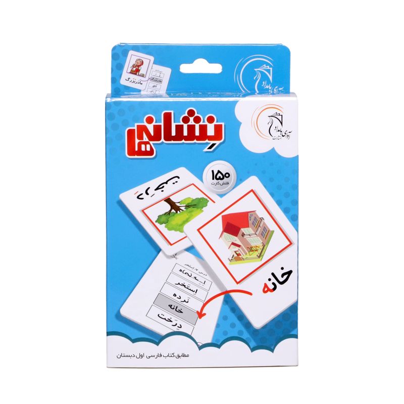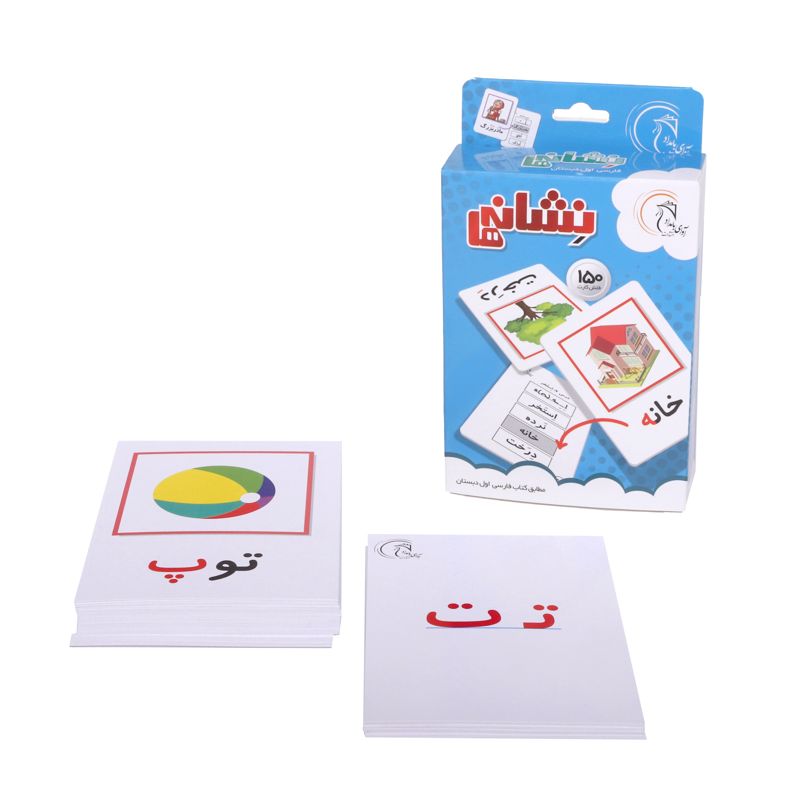 کارتهای نشانهها شامل مجموعهای ۱۵۰ کارت است که تمام حروف الفبای فارسی و جایگاه آنها در کلمات مختلف را دقیقاً مطابق کتاب فارسی اول دبستان نشان میدهند. تصاویر جذاب و کیفیت کارتها باعث میشود کودکان با اشتیاق بیشتری نسبت به کتاب درسی تمرینات را انجام دهند. هر بار که کارتی به کودک نشان داده میشود به تصویر و شکل کلی نوشتاری کلمه توجه میکند از آنجا که جایگاه حروف مورد نظر به رنگ قرمز چاپ شدهاند این شکل خاص حروف در ذهن کودک نقش میبندد. ۳۰ کارت از این مجموعه به حروف الفبا اختصاص یافته است که دانشآموز میتواند کارتهای مربوط به جایگاه هر حرف کنار کارت مربوط به آن بچیند.