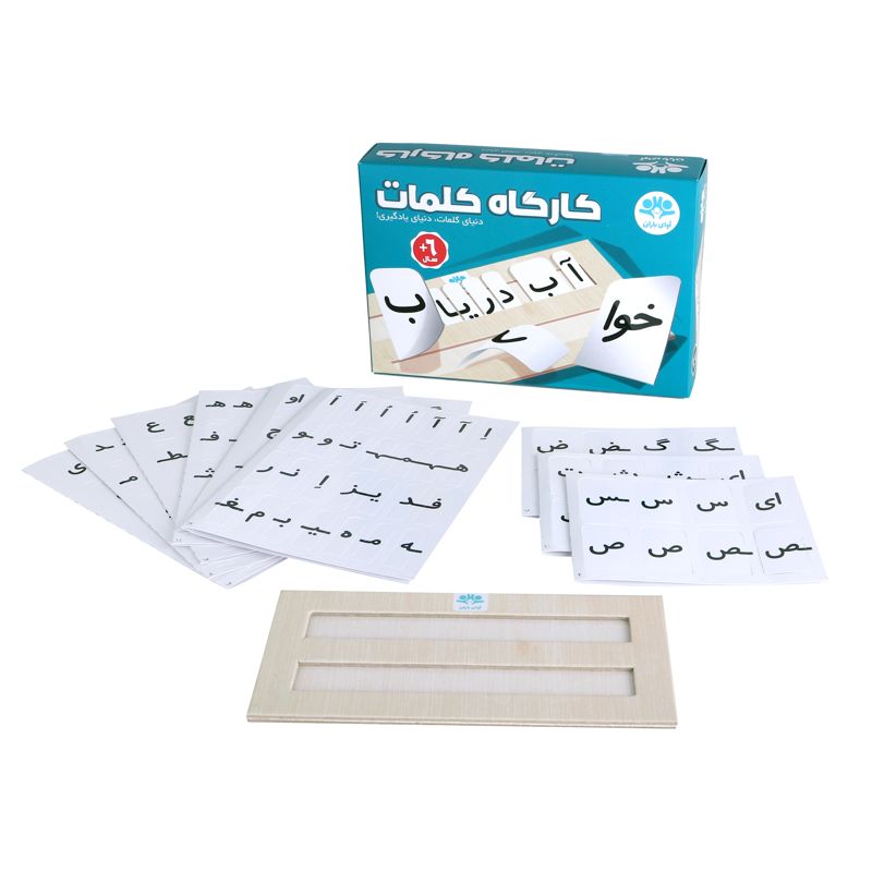 کارگاه کلمات وسیلهای است فوقالعاده برای تمرین شکل نوشتاری کلمات و همچنین ساختن جملهها؛ بخصوص برای آنها که در برابر نوشتن مقاومت میکنند. در این وسیله تمامی شکلهای حروف در ابتدا، وسط و آخر کلمه به صورت کارتهای کوچک و به تعداد کافی وجود دارد. کودک میتواند به راحتی با کنار هم قرار دادن و جایگذاری آنها در شکاف صفحهی کارگاه، تمامی کلمات کتاب فارسی اول ابتدایی و همچنین هر کلمهی دیگری را بسازد و از این راه املای کلمات را به صورت حروف چاپی تمرین کند. با توجه به دو ردیفه بودن صفحه، امکان ساخت جملات کوتاه نیز وجود دارد.