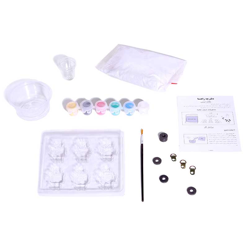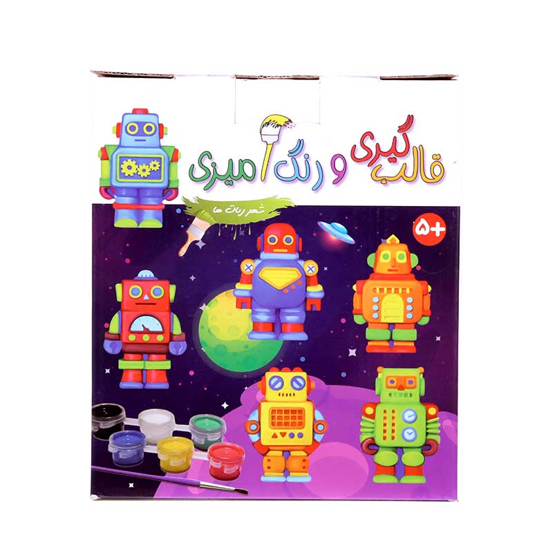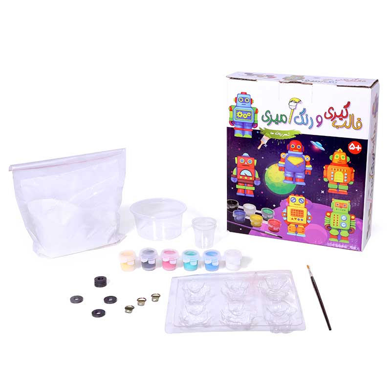 ساختن مجسمههای کوچک به وسیلهی قالبگیری تجربهی بینظیری است که میتواند در ایجاد اعتماد به نفس در کودکان نقش قابل توجهی داشته باشد. مجموعهی قالبگیری و رنگآمیزی شهر رباتها با ارائهی وسایل لازم فرصت چنین تجربهی دلنشینی را برای آنان فراهم میسازد. این مجموعه شامل پودر مجسمهسازی، دو پیمانه، یک کاسه برای درست کردن خمیر، قالب برای ۶ مدل مختلف ربات، شش رنگ اصلی گواش، یک قلم مو، شش قطعه آهنربای حلقهای و دفترچهی راهنماست. کودکان میتوانند از ۵ سالگی، تحت نظارت بزرگترها، خمیر مجسمهسازی را آماده و قالبگیری و پس از اضافه کردن آهنربا، در نهایت آنها را با خلاقیت خود رنگآمیزی کنند. از ماکتهای آماده شده میتوان برای تزئین روی یخچال یا هر سطح فلزی دیگر استفاده کرد. در عین حال میتوان آنها را به صورت کولاژ در نقاشیها به کار برد و تابلوهای برجسته خلق کرد.