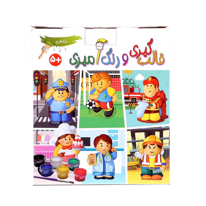 عمل ساختن یا خلق چیزی، هر چه که باشد، در بالا بردن اعتماد به نفس سازنده نقش مؤثری دارد. مجموعهی قالبگیری و رنگآمیزی مشاغل نه تنها چنین فرصتی را ایجاد میکند بلکه امکان آشنایی کودکان با مشاغل مختلف را هم فراهم میسازد. این مجموعه شامل پودر مجسمهسازی، دو پیمانه، یک کاسه برای درست کردن خمیر، قالب برای ۶ آدمک نماینده مشاغل گوناگون، شش رنگ اصلی گواش، یک قلم مو، شش قطعه آهنربای حلقهای و دفترچهی راهنماست. کودکان میتوانند از ۵ سالگی، تحت نظارت بزرگترها، خمیر مجسمهسازی را آماده و قالبگیری و پس از اضافه کردن آهنربا، در نهایت آنها را با توجه به شغل هر آدمک رنگآمیزی کنند. از ماکتهای آماده شده میتوان برای بازیهای تخیلی و نقشآفرینی یا تزئین روی هر سطح فلزی استفاده کرد. از دیگر فواید این مجموعه میتوان به افزایش صبوری و پرورش خلاقیت اشاره کرد.